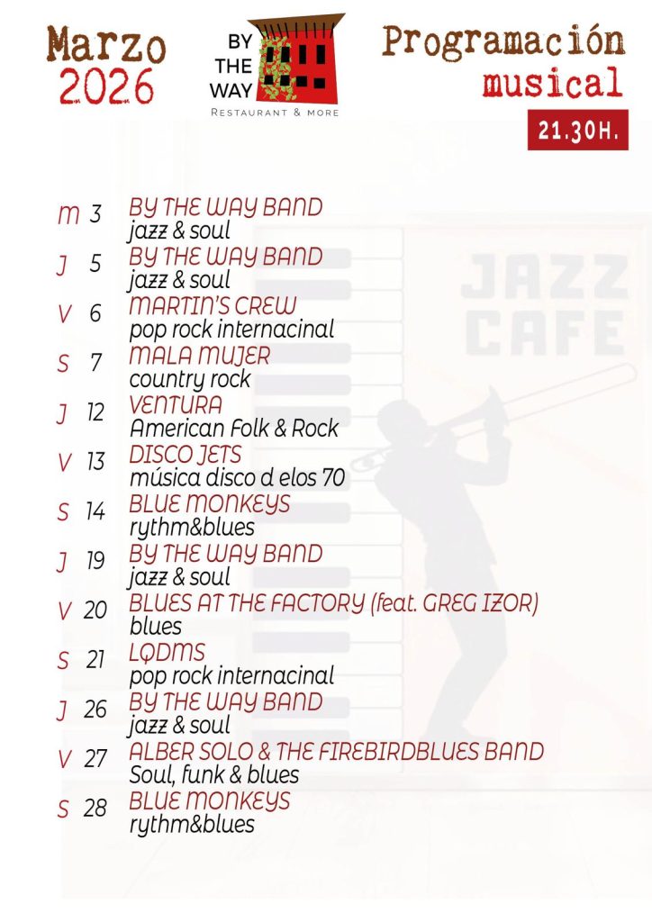 MARZO de 2026.Marzo nos va a dar muchas alegrías con los grupos que nos visitan.Destacamos Ventura, grupo de folk americano que nos encantó en enero. Su repertorio es de Crosby, Stills & Nash, The Band, America, Dylan…y bordan las armonías vocales. También no os podéis perder a Disco Jets si te gusta la música bailable de los 70. Llevan ya varias veces actuando en BTW y son siempre un éxito. Además Martin’s Crew, pop rock internacional excepcionalmente cantado por Esperanza Martín o Lo que diga mi señora (LQDMS), también pop rock internacional super bien ejecutado.Y por supuesto clásicos como Blue Monkeys, Alber Solo & the Firebirdblues band y la banda de jazz residente, By The Way band.