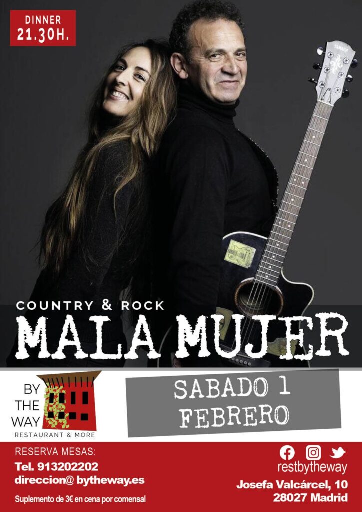 cONOCE MÁS Mala Mujer en directo – Sábado 1 febrero 2025 Una noche de country rockDe nuevo nos visitan el dúo más American folk del panorama de Madrid. Susana, cantante de excelente voz melodiosa, se compenetra en escena a la perfección con Morgan, veterano cantante y guitarrista de la escena madrileña durante muchísimos años. Solo con la guitarra acústica y armónica dan sonoridad folk que te transporta a temas de Dylan, America, James Taylor, Joan Baez, Eagles o Van Morrison. También muy recomendable por su sentido del humor en el escenario durante todo el show. 🎶✨ 📅 Cuándo: Sábad0, 1 de febrero de 2025🕗 Hora: A partir de las 21:45h📍 Dónde: By The Way🎟️ Entrada libre hasta completar aforo. Suplemento 3€ adicionales a la cena. https://youtu.be/eDPVuTMh1Vg?si=_sb0UuhcDV9dKeu_