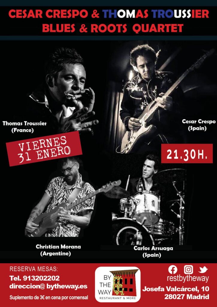 cONOCE MÁS César Crespo & Thomas Croussier Quartet en directo – Viernes 31 enero 2025 Thomas Troussier es un armonicista de origen normando y residente en Nantes.Forma parte de proyectos de altísimo nivel en en el país vecino como The Freaky Buds yArnaud Fradin & His Roots Combo. De la mano del gran Tonky de La Peña visitó España porprimera vez hace cerca de 15 años donde conoció a Cesar Crespo, guitarrista, cantante y compositor con una trayectoria meteórica en el circuito de Blues & Roots liderando proyectos como The Pinball´s Blues Party o The Chicken Wings y acompañando a numerosísimas figuras nacionales e internacionales y con una sorprendenteversatilidad que le permite actualmente formar parte de proyectos como The Royal We (Country), The All Night Long Big Band (Blues-Jazz) o como la mítica banda de Garage/Powerpop Doctor Explosion en la que milita desde hace 2 años.Thomas Troussier es sin duda alguna uno de los armonicistas con un tono y fraseo máselegantes, demuestra un gusto, saber estar y conocimiento del lenguaje exquisitos lo que leha valido en nuestras tierras el sobrenombre de «El Príncipe de Nantes».Junto a Carlos Arsuaga a la batería y Christian Morana al bajo, una de las bases rítmicas más sólidas y solicitadas del circuito, forman este cuarteto que viaja por los grandes clásicos y joyas ocultas de su amplio repertorio de Blues & American Roots Music. Enorme nivel! 🎶✨ 📅 Cuándo: Viernes 31 de febrenero de 2025🕗 Hora: A partir de las 21:45h📍 Dónde: By The Way🎟️ Entrada libre hasta completar aforo. Suplemento 3€ adicionales a la cena. https://www.youtube.com/watch?v=8VT54AqYhv0