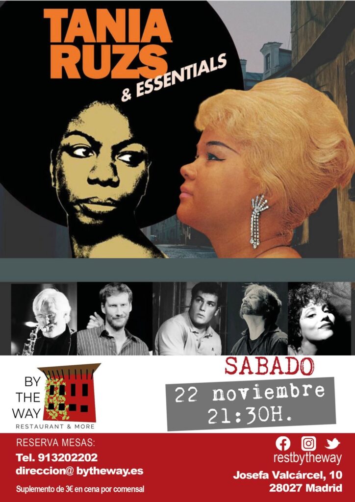cONOCE MÁS Tania Ruzs, sábado 22 noviembre 2025 Un Tributo a las grandes voces de los 50 y 60, La voz salvaje de la gran Etta James, y la sacerdotisa de la voz Nina Simone. Figuras relevantes del soul y blues de una época marcada por la pasión e intensidad en sus voces únicas. Tania Ruzs’Tributes & Essential nos regalarán un emotivo y potente espectáculo donde la emoción, la fuerza y la garra de la icónica voz de Tania Ruzs, el soul a las teclas de Jaime Zelada, el flow del bajo de mano de Adrián de la Peña y Will Morton a la batería nos regalarán un concierto apasionado 📅 Cuándo: Sábado, 22 de noviembre de 2025🕗 Hora: A partir de las 21:45h📍 Dónde: By The Way🎟️ Entrada libre hasta completar aforo. Suplemento 3€ adicionales a la cena. https://youtu.be/CUoNVji8YMs