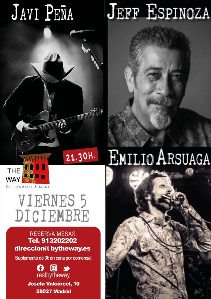 cONOCE MÁS Jeff Espinoza, Emilio Arsuaga & Javi Peña en directo Blues y country folk americano de la mano de tres enormes músicos. Jeff es uno de los bluesmen más importantes del panorama nacional desde hace más de 40 años. En esos años 80 llegó a nuestro país, formando muchas formaciones como Flying Gallardos, Vargas Blues Band, Red House (junto a Francisco Simón) y actualmente con J. Espinoza & The Gypsy Runners.Jeff hace blues y folk americano. Hace innumerables actuaciones con gente del nivel de Lou Marini (Blues brothers) o Ramón Arroyo de Los Secretos. Este californiano es una institución que no debes perderte. Javi Peña es un guitarrista, compositor y productor madrileño cuyo trabajo incluye dar soporte a otros grandes artistas locales y desarrollar su propia carrera con otras formaciones. En todos los casos un trabajo que siempre viene marcado por su exquisito gusto y enorme técnica con la guitarra. Revolver, Marlango, Red House son algunos de sus grupos habituales… Y Emilio Arsuaga, gran armonicista, además de guitarrista y cantante. Influenciado por enormes músicos como Little Walter, Sonny Boy Williamson (2- Rice Miller), Big Walter Horton y Sonny Terry, Emilio. Miembro de King Bee, Arsuaga empezó en la música como guitarrista para acabar dedicando sus esfuerzos al mismo instrumento que Lester. Ahora le dedica el supremo Lazy Lester Forever (Rock CD) grabado en Austin, Texas. Emilio conoció a Lester en 2013, y se convirtió junto a su hermano Carlos Arsuaga en Lazy Boots, siendo la banda de acompañamiento de Crazy Lester en su gira española. Y casi al mismo tiempo se publica I’m Here To Stay (Rock CD), firmado junto a The Mad Reeds, como el propio Emilio dice, “su banda española”. Once canciones en las que el músico y su banda se mueven por un sonido pantanoso, lleno de blues, zydeco, swamp y country, combinando temas propios con excelentes versiones como el «I’m Ready» de Fats Domino o el «Can’t Hold On Much Longer». Demostrando el ya longevo buen estado del blues patrio. Cuándo: Viernes, 5 de diciembre de 2025 Hora: A partir de las 21.30h Dónde: By The Way Entrada libre hasta completar aforo. Suplemento 3€ adicionales a la cena. https://www.youtube.com/watch?v=t9e8rYzHfKI