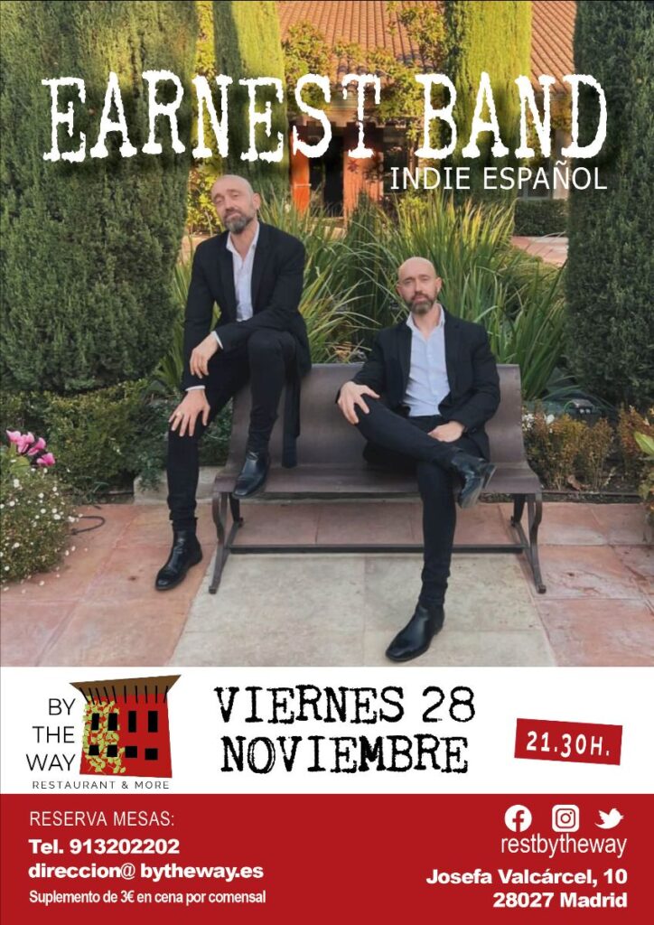 cONOCE MÁS EARNEST band Indie español. Nos salimos de nuestro enfoque habitual con versiones de grupos indies de época actual y algunos algo más antiguos: Carolina Durante, Arde Bogotá, Izal, Love of Lesbian, Vetusta Morla, Lori Meyers…¡Esperamos que os guste! 🎶✨ 📅 Cuándo: Viernes 28 de noviembre de 2025🕗 Hora: A partir de las 23h📍 Dónde: By The Way🎟️ Entrada libre hasta completar aforo. Suplemento 3€ adicionales a la cena.