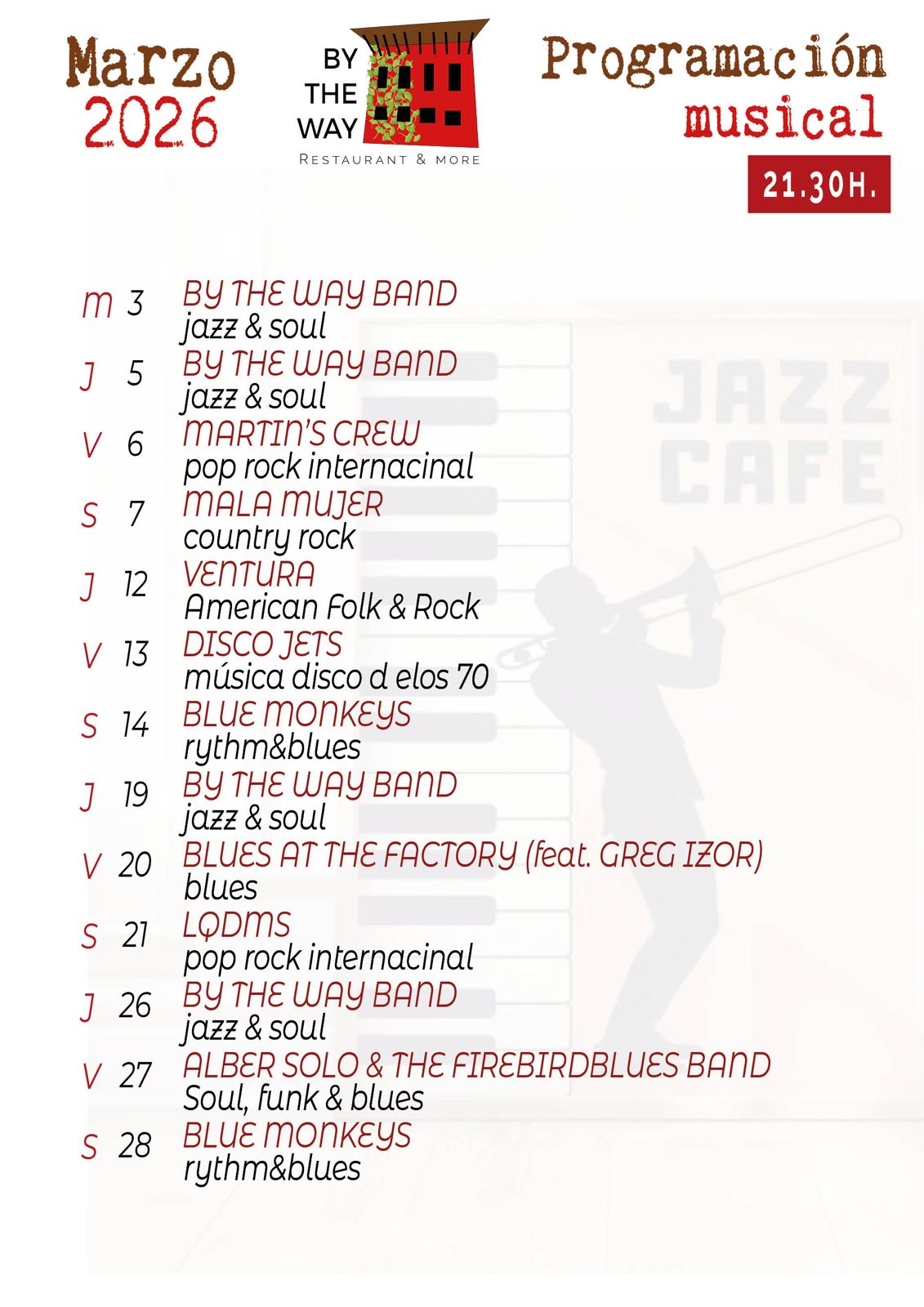 Y por supuesto clásicos como Blue Monkeys, Alber Solo & the Firebirdblues band y la banda de jazz residente, By The Way band.